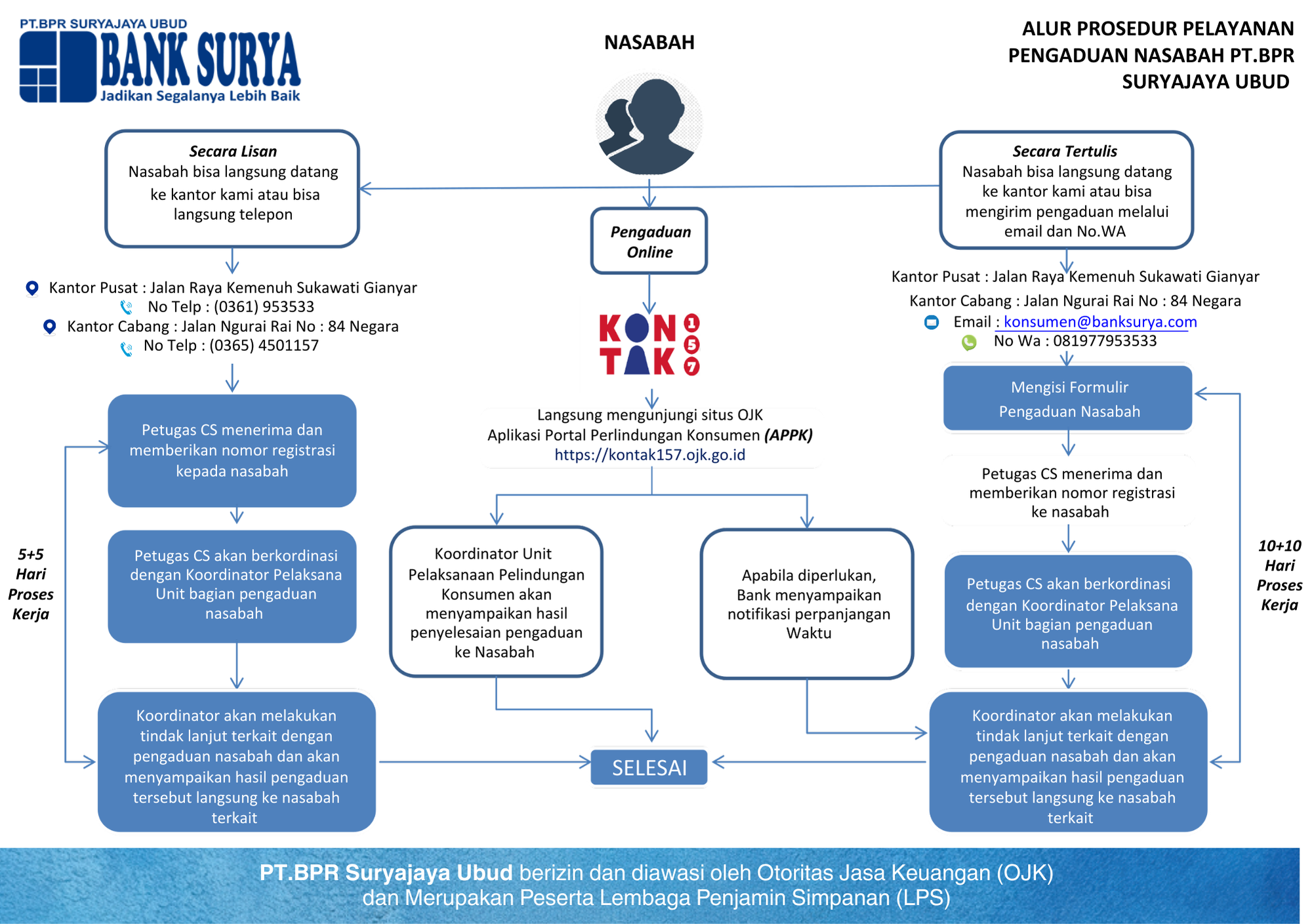 PT. BPR Suryajaya Ubud menyediakan layanan pengaduan nasabah melalui tiga jalur: lisan, tertulis, dan online. Pengaduan secara lisan dapat disampaikan melalui telepon atau langsung ke kantor pusat, sementara pengaduan tertulis bisa dikirim melalui email atau surat (unduh form pengaduan disini). Nasabah juga dapat mengajukan pengaduan melalui situs OJK di https://kontak157.ojk.go.id. Setiap pengaduan akan diterima oleh PIC (Person in Charge) yang memberikan nomor registrasi dan menindaklanjuti bersama unit terkait. Proses penyelesaian dilakukan maksimal 5+5 hari kerja untuk pengaduan lisan dan 10+10 hari kerja untuk tertulis. Jika diperlukan, bank akan memberi notifikasi perpanjangan waktu.