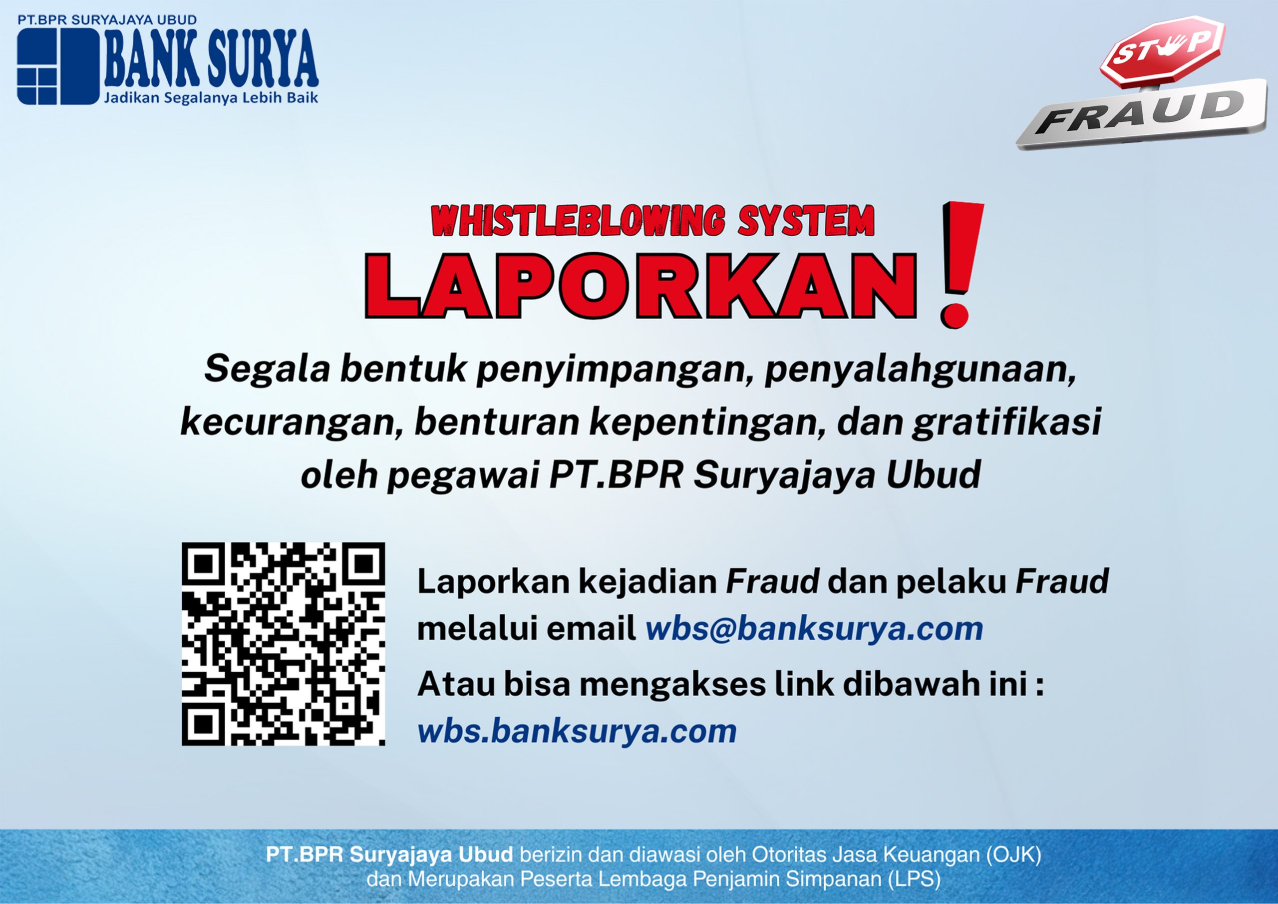 Whistle Blower System (WBS) merupakan sarana yang diberikan kepada Pelapor Internal PT. BPR Suryajaya Ubud maupun Eksternal (nasabah, khalayak, mitra) dalam menyampaikan informasi indikasi pelanggaran, dan akan ditindaklanjuti sesuai dengan mekanisme yang telah ditentukan oleh Bank. Pelapor dapat menyampaikan laporan melalui email, website, ataupun mengirim surat tertulis yang ditujukan kepada PT. BPR Suryajaya Ubud yang kemudian akan diproses.